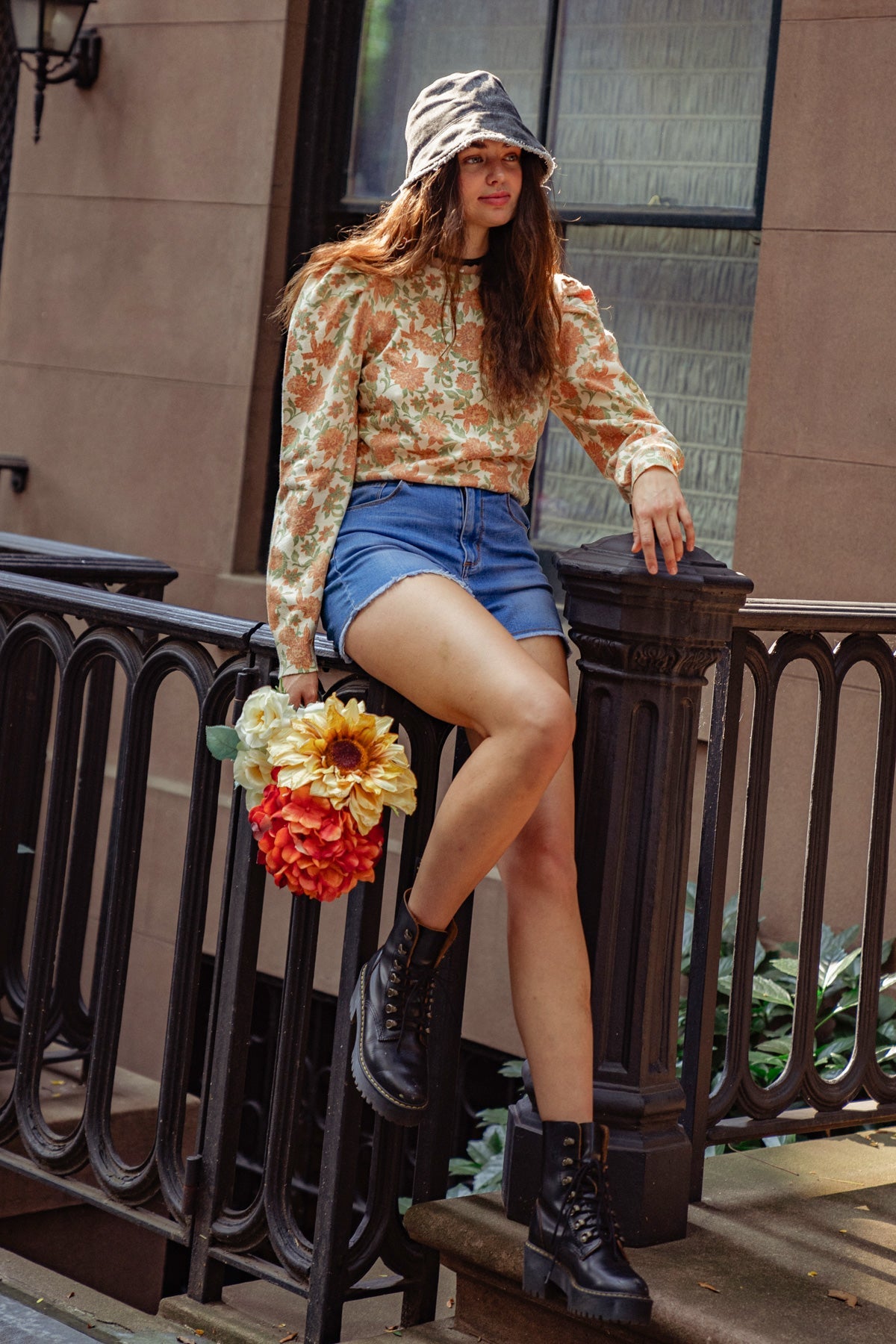 Olga-Blue Floral Print Short Puff Sleeve Button Up Shirt