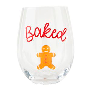 Celebrate the season in style with these festive stemless wine glasses, each featuring a hand-applied blown glass Christmas icon and playful holiday sayings. Choose from whimsical designs like a gingerbread man (“Baked”), a snowman (“Feelin’ Frosty”), or a Christmas tree (“Holiday Helper”). The attached blown glass figure adds a unique, cheerful touch, making these glasses perfect for holiday parties, gifting, or adding a little extra spirit to your own collection.