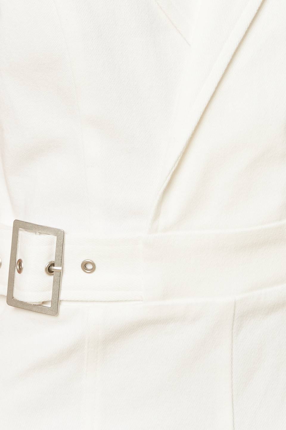 A sleeveless solid white woven jumpsuit featuring surplice neckline with collar, attached side belt, wide leg and back zipper closure.
