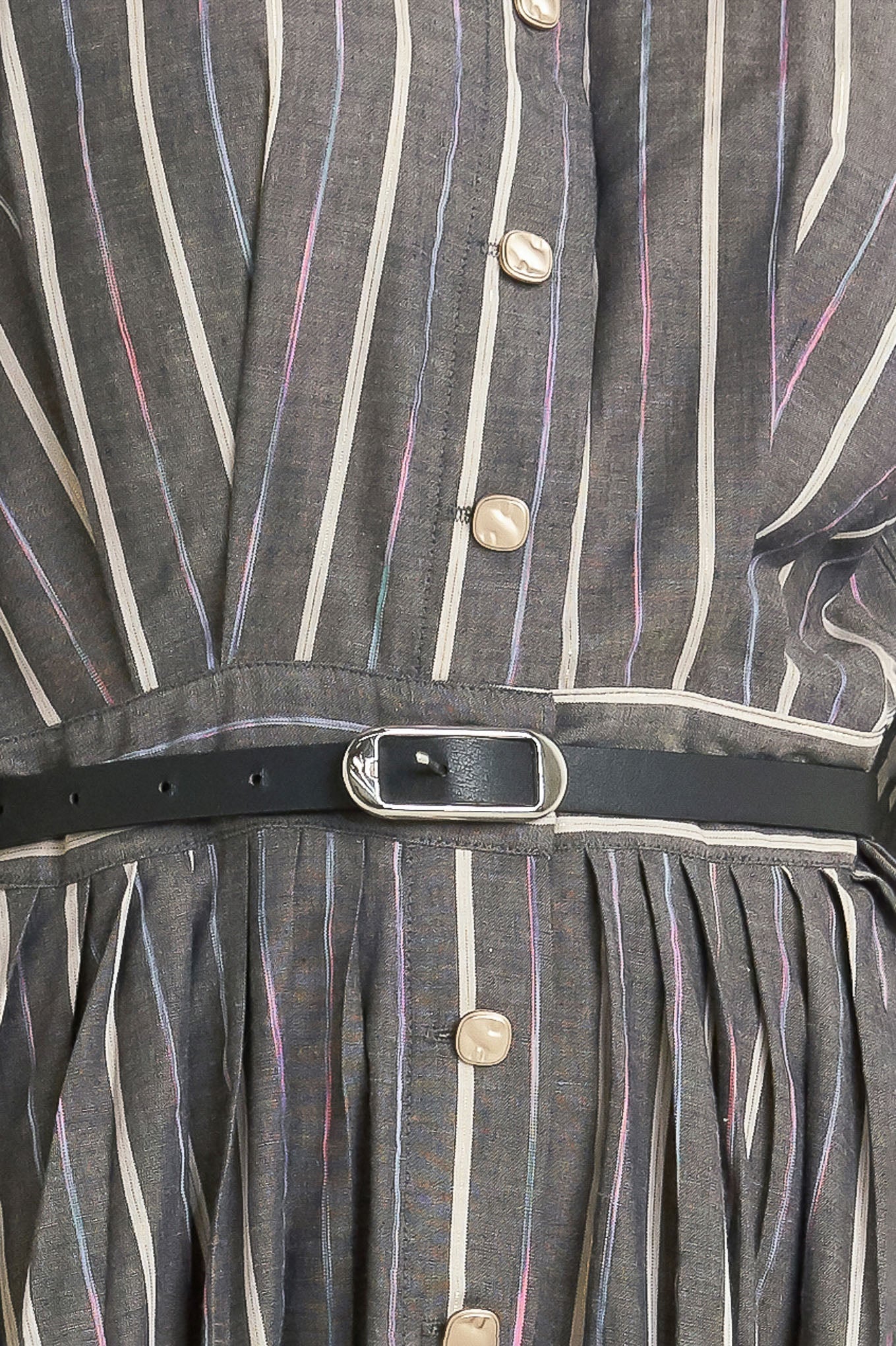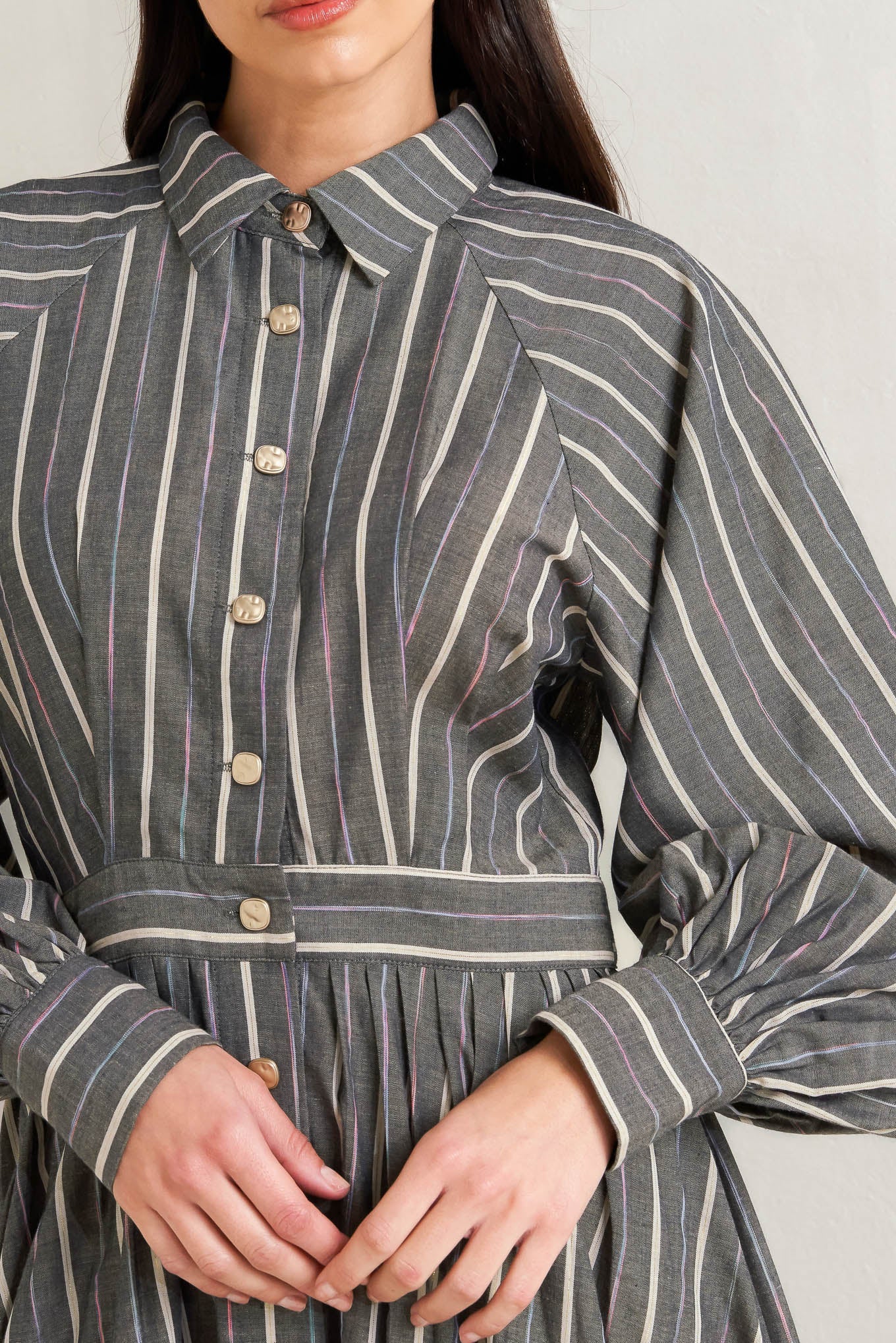 A striped woven midi dress featuring shirt collar, button down, raglan sleeve with cuff and full skirt