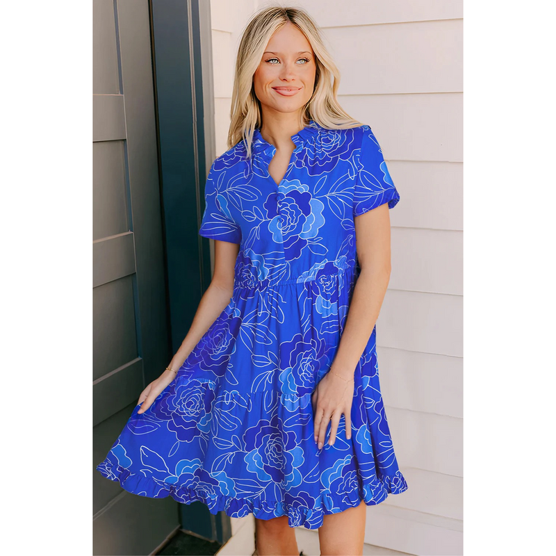 Step into sunshine with this playful blue floral mini dress. Featuring a flattering V-neck and short sleeves, its flowy fabric and ruffled hem add a fun, flirty touch perfect for warm days and spontaneous adventures. Easy to wear and effortlessly charming, it’s your go-to for a breezy, joyful look.