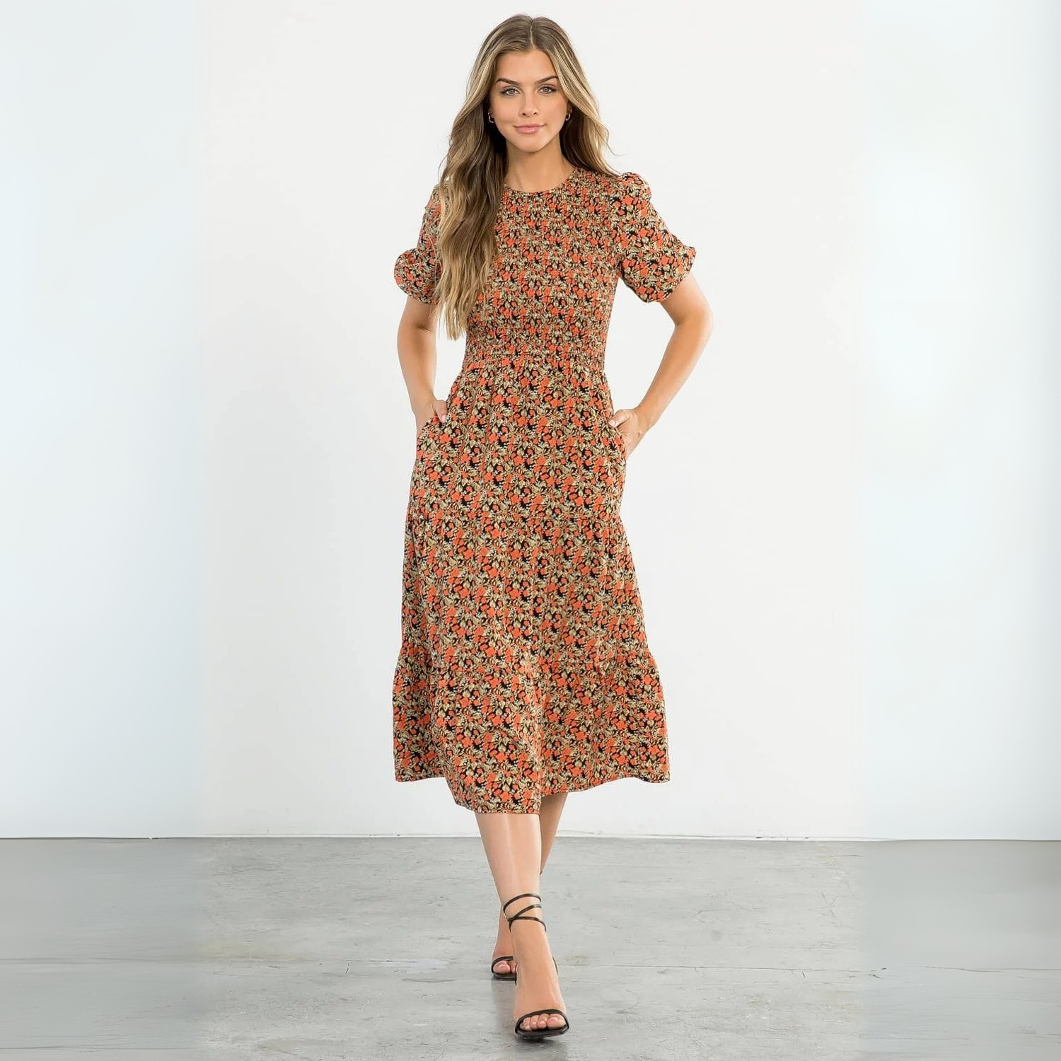 Agnes-Smocked Floral Print Midi Dress – Boutique Women’s Woven 100% Polyester Midi