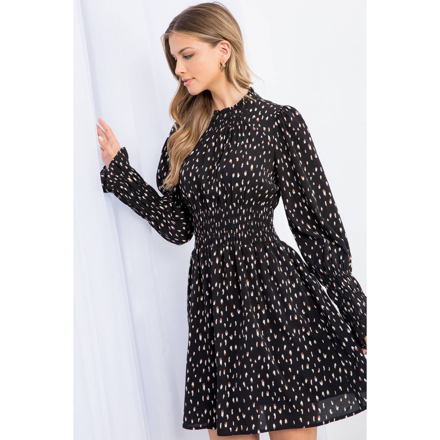 Gretchen Smocked Waist Print Dress – Boutique Long Sleeve Mini with Feminine Detail