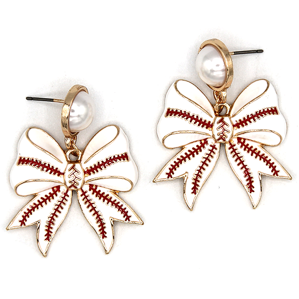 Enamel Pearl Bow Baseball Gameday Drop White Earrings