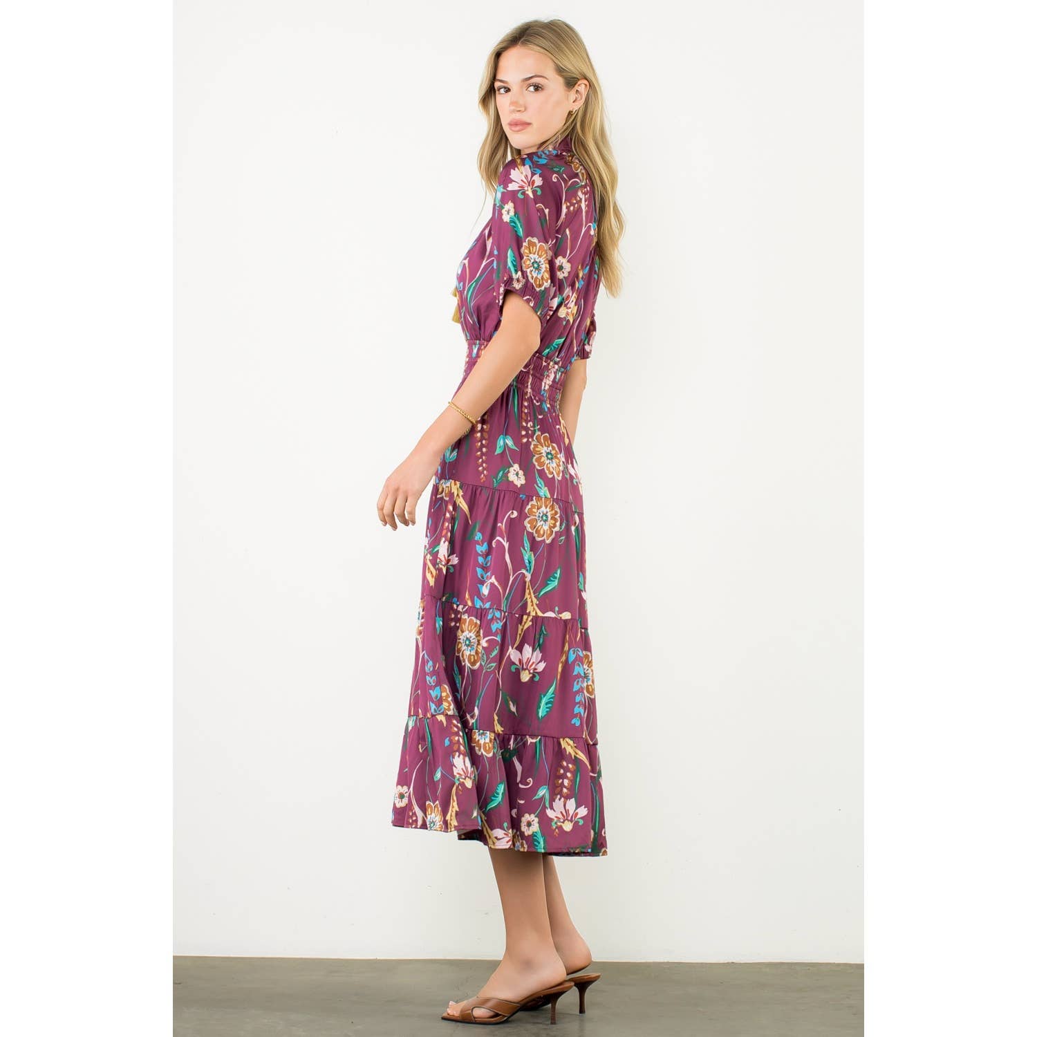 Short Sleeve Floral Tiered Maxi Dress . / Style Measurements for Size S / Designed in USA - Body Length: 50 1/2 in - Bust Width: 34 in - Sleeve Length: 15 in . / Model Sizes - Wearing Size S - Height 5' 9", Bust 32", Waist 25 1/2", Hips 36" . Fabric Content - WOVEN / 98% Polyester, 2% Spandex