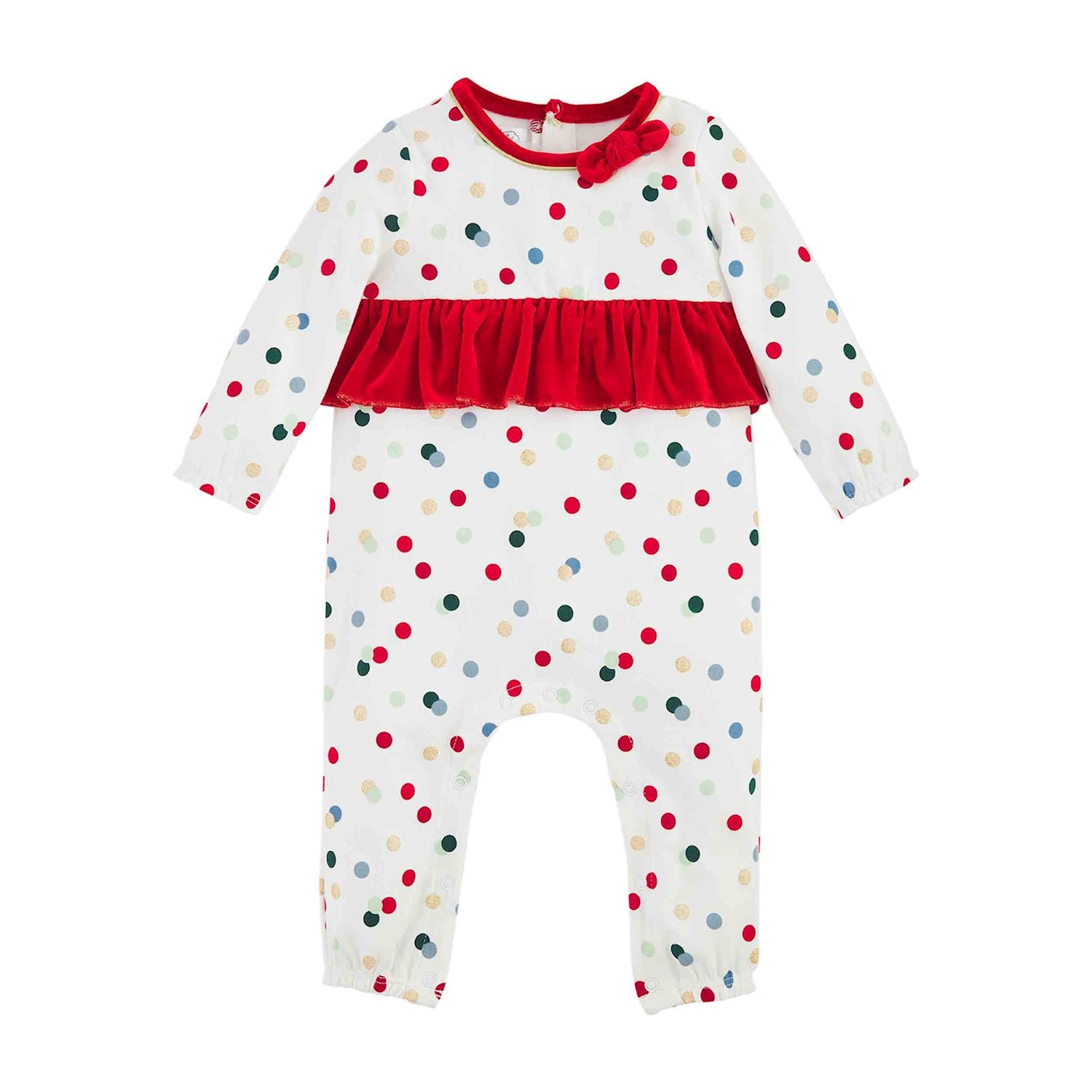 Transform your little one into the life of the Christmas party with our Confetti Christmas One-Piece! Made with soft cotton interlock, it features a luxurious velvet chest ruffle and adorable neckline bow. Plus, the inner leg snap closure makes changing quick and easy. Add some festive fun to your baby's wardrobe now!