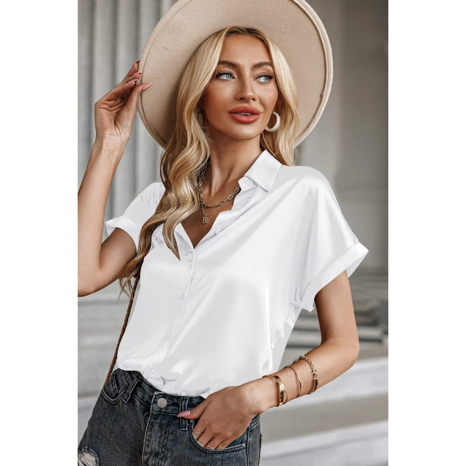 Satin Button-Up Short Sleeve Top – Boutique Women’s Solid Color Blouse