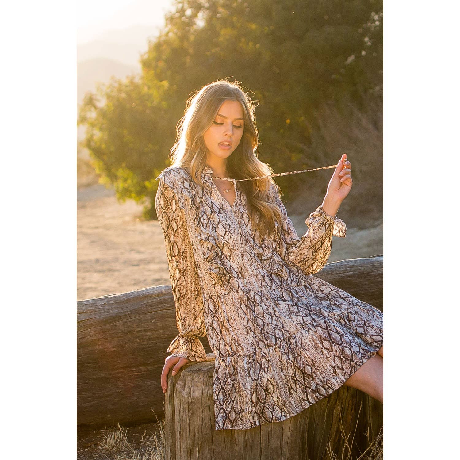 Embrace bold elegance with the Vera-Snake Print Ruffle Dress. Crafted from lightweight, woven 100% polyester, it ensures comfortable wear while making a striking statement. Featuring playful ruffles and a flattering silhouette, this dress complements your curves with a 39-inch bust width and a body length of 34½ inches in size S. Designed in the USA, it pairs effortlessly with your favorite accessories for a confident, stylish look every time you step out.