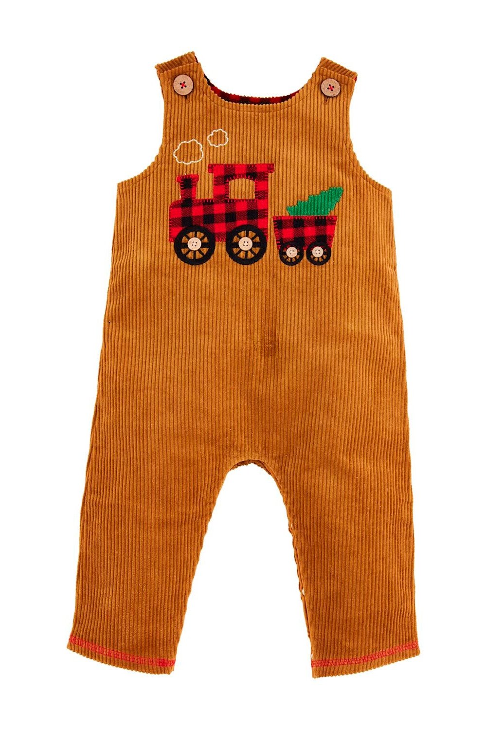 Train Overalls – Appliqued Corduroy Longalls with Coconut Wood Buttons