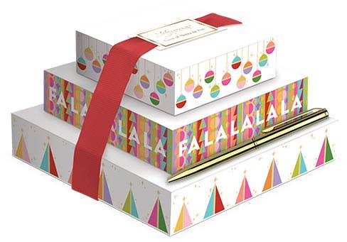 - Includes: Three stacked notepads + gold metal ballpoint pen with ribbon