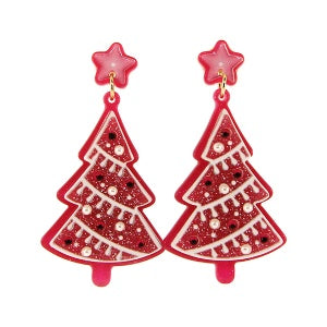 Glitter resin pearl accent Christmas tree pink Christmas earrings