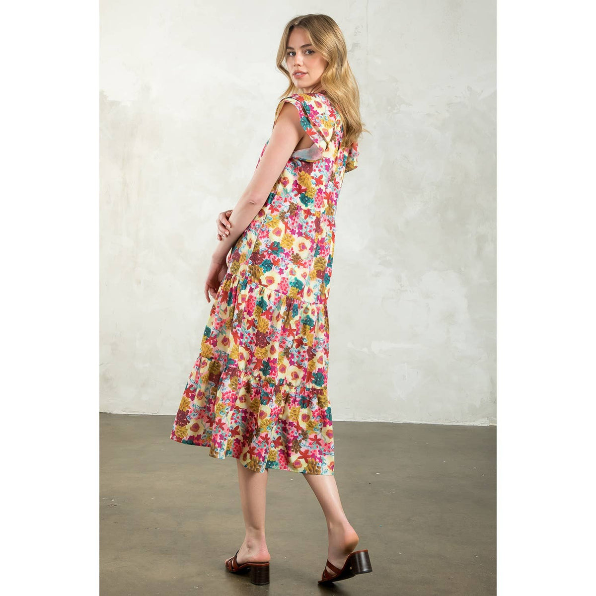 Mia-Orange Floral Print Tie Neck Long Sleeve Dress