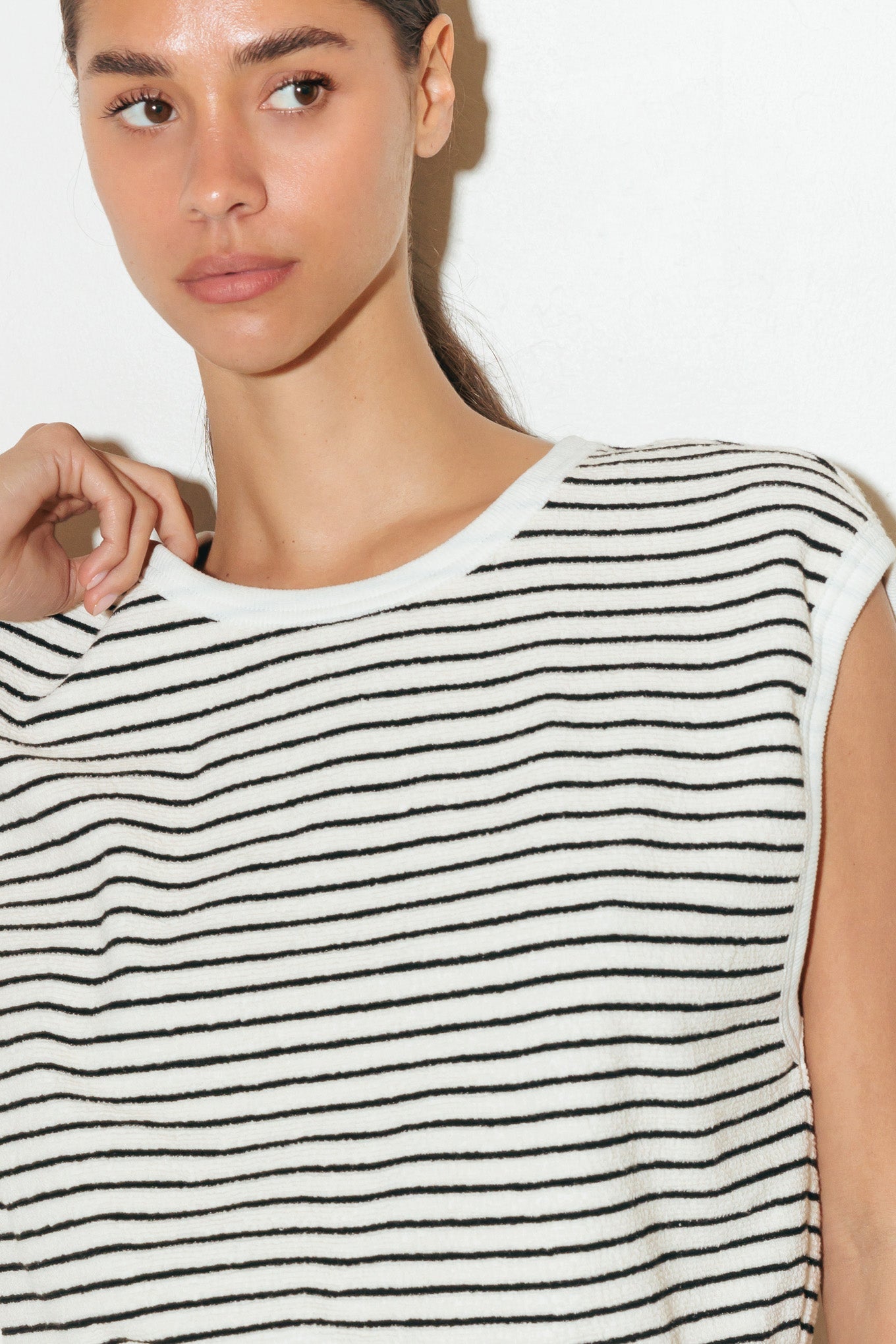A striped knit romper featuring round neckline, sleeveless, draw string waist, side pocket, surplice back with button closure