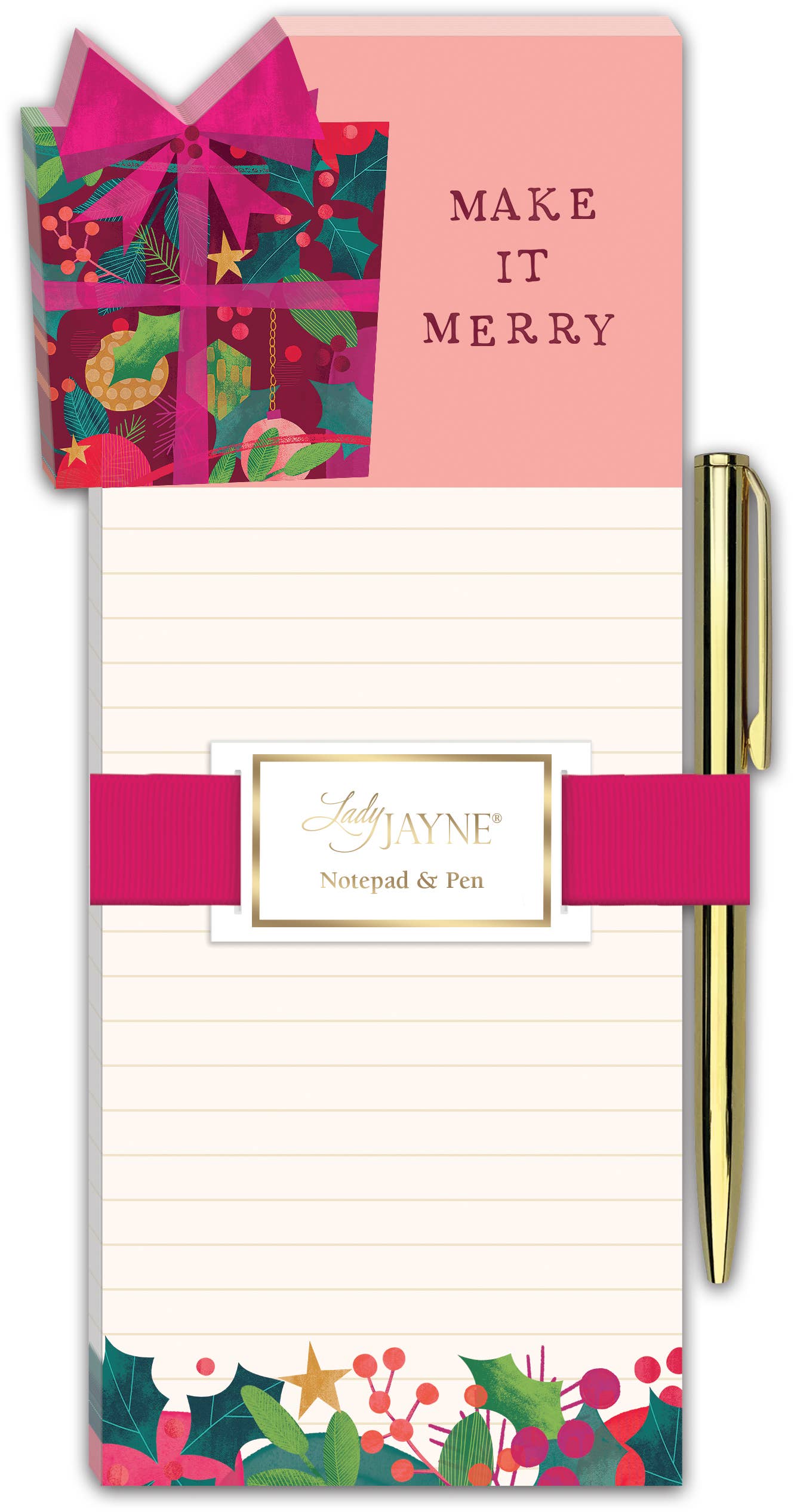 Deck the Halls Present Die-Cut Notepad – Holiday Gift-Shaped Notepad with Gold Pen