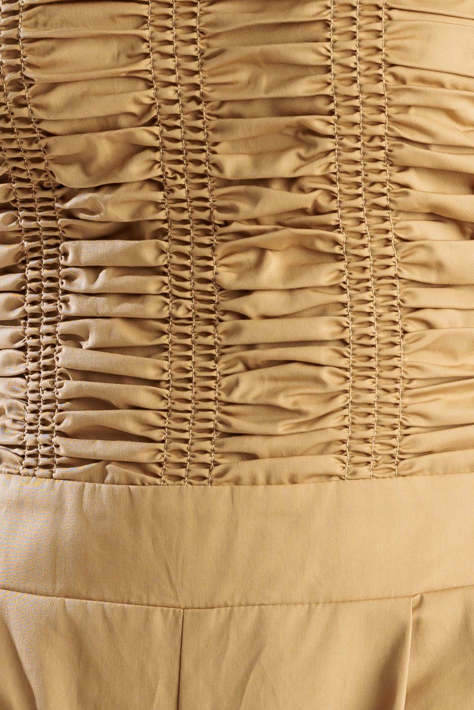 A solid woven jumpsuit featuring straight neckline, smocked bodice, straps, side pockets, wide leg, and back zipper closure
