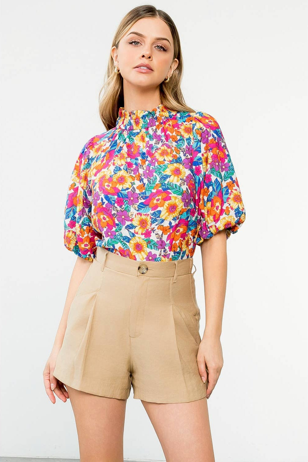 Chloe-Black Tropical Print Bubble Sleeve Knot Front Blouse