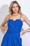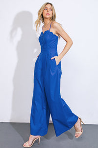 A solid woven jumpsuit featuring scalloped bodice edge, shoulder strap, button down, pleated front pant, wide leg and back zipper closure