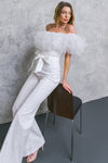 This READY FOR THE WEEKEND WHITE DENIM JUMPSUIT is the perfect outfit for your next big night out. It has an off-shoulder neckline with a tulle flounce, a back zipper closure and a self-tie for an adjustable fit. The flare pant with a seam at the center front adds a touch of style. Experience comfort and sophistication with this denim jumpsuit.