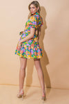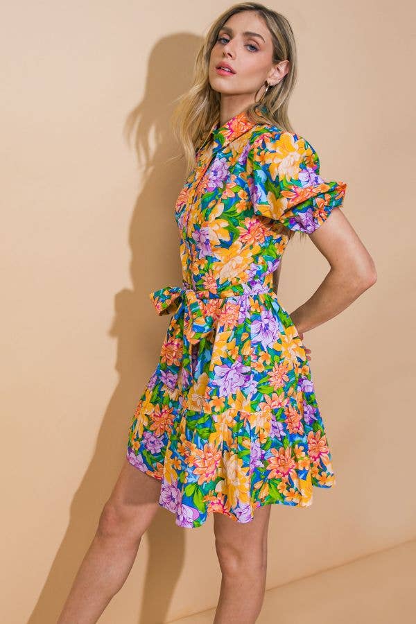 A printed woven mini dress featuring shirt collar, button down, short puff sleeve, self sash tie and ruffled hemline