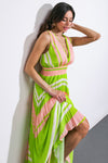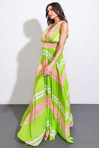A printed woven maxi dress featuring V neckline, sleeveless, smocked waist band, pleated skirt and V back with tie
