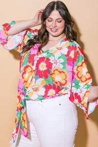 Indulge in our exquisite woven top, boasting a V neckline, elegant kimono sleeves, and chic front tie detailing.