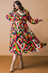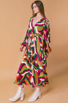 A printed plisse midi dress featuring surplice neckline, long sleeve, elasticized waist and self sash tie