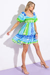A printed woven mini dress featuring smocked bodice, short puff sleeve, ruffled hemline and smocked back bodice