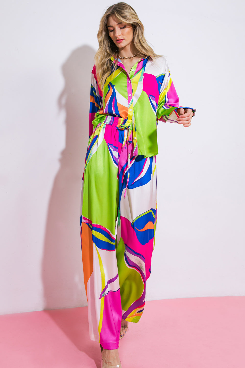 A printed woven pant featuring elasticized waist with tacked tie and wide leg. Matching top IT12932