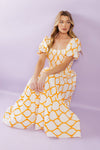 A printed woven midi dress featuring square neckline, short puff sleeves, smocked waistband, full skirt and ruffled hemline