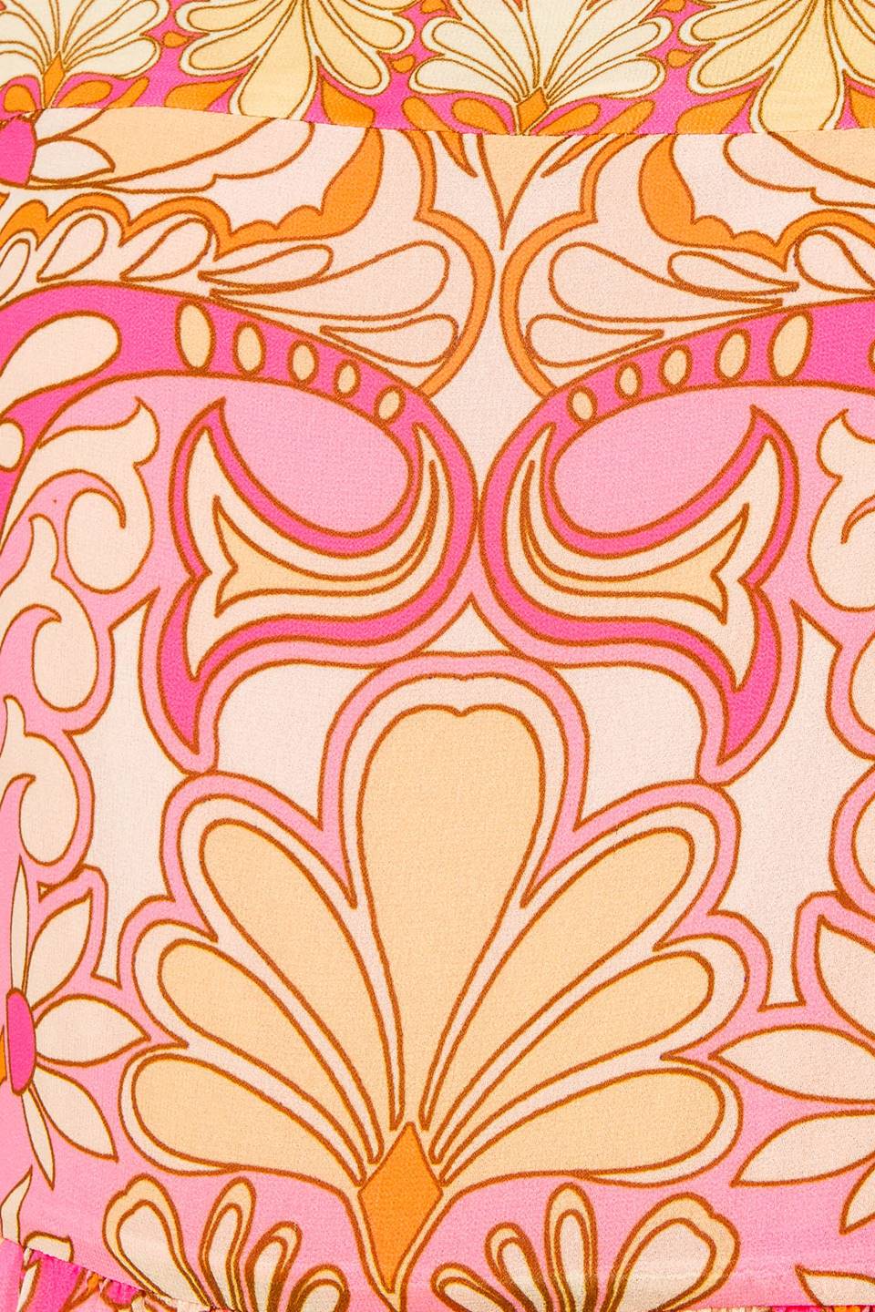 This woven maxi dress showcases a printed design, along with a straight neckline, shoulder tie, tiered skirt, and a back zipper closure.