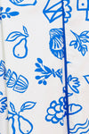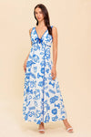 A printed woven ankle dress featuring V neckline with front bow tie, sleeveless, full skirt and plunging V back with zipper closure