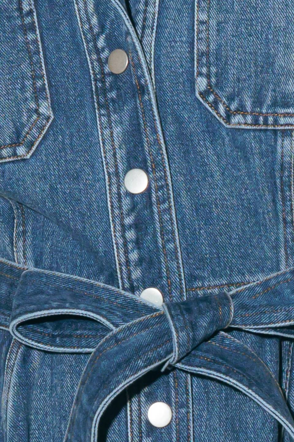 A washed denim midi dress featuring collar, short sleeve, front and side pockets,, button down and self sash tie.
