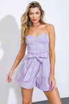 A sophisticated romper, washed with acid for a unique look, boasting a sweetheart neckline, self sash tie, convenient side pocket, smocked back bodice, and side zipper closure.