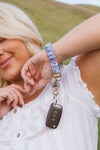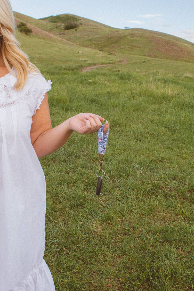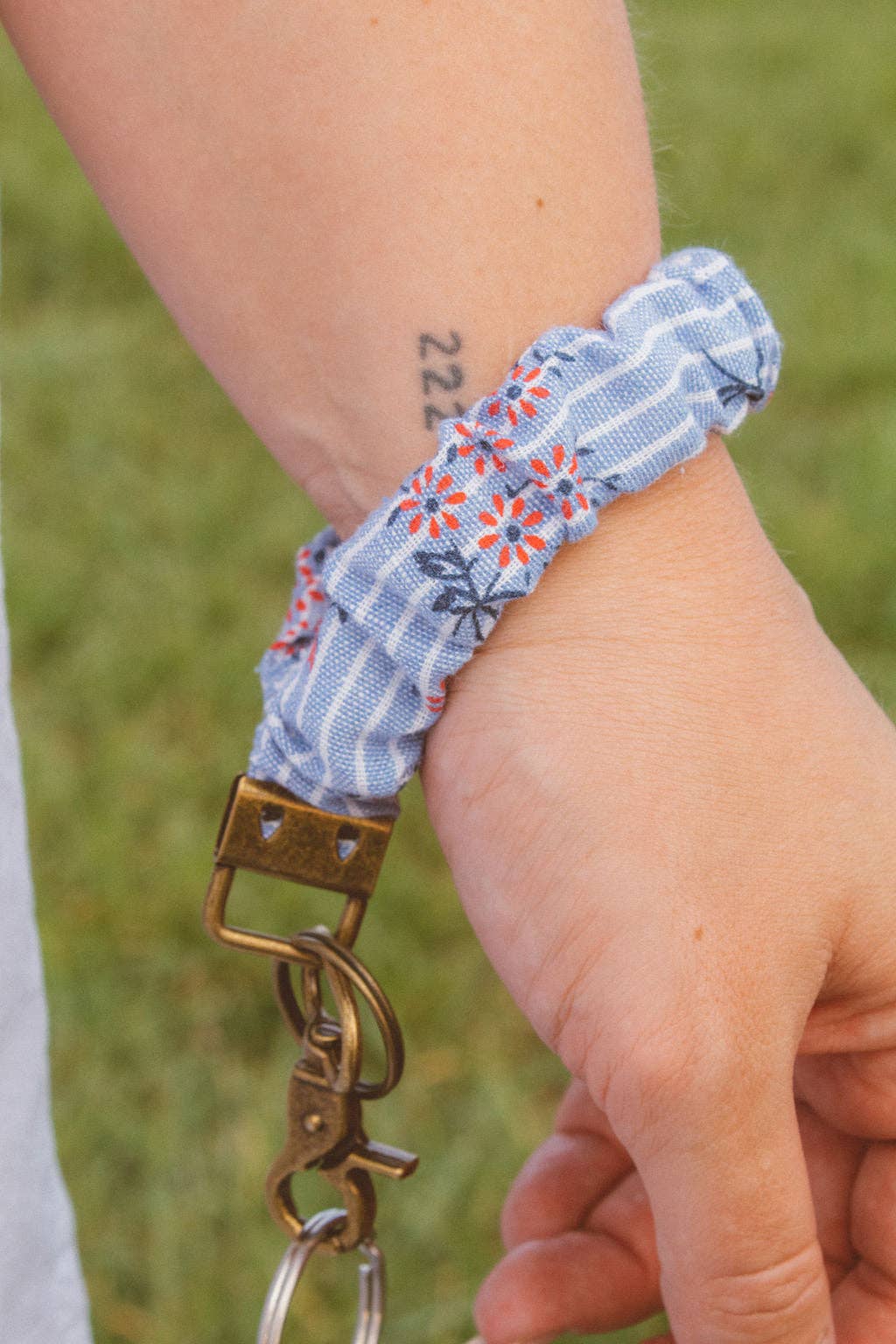 Andi keychains are the cutest you'll find! This keychain is a darling red, white, and blue floral striped fabric! Get this to hold all your necessities and keep your pockets and hands free while adding a cute and stylish flair.
