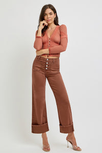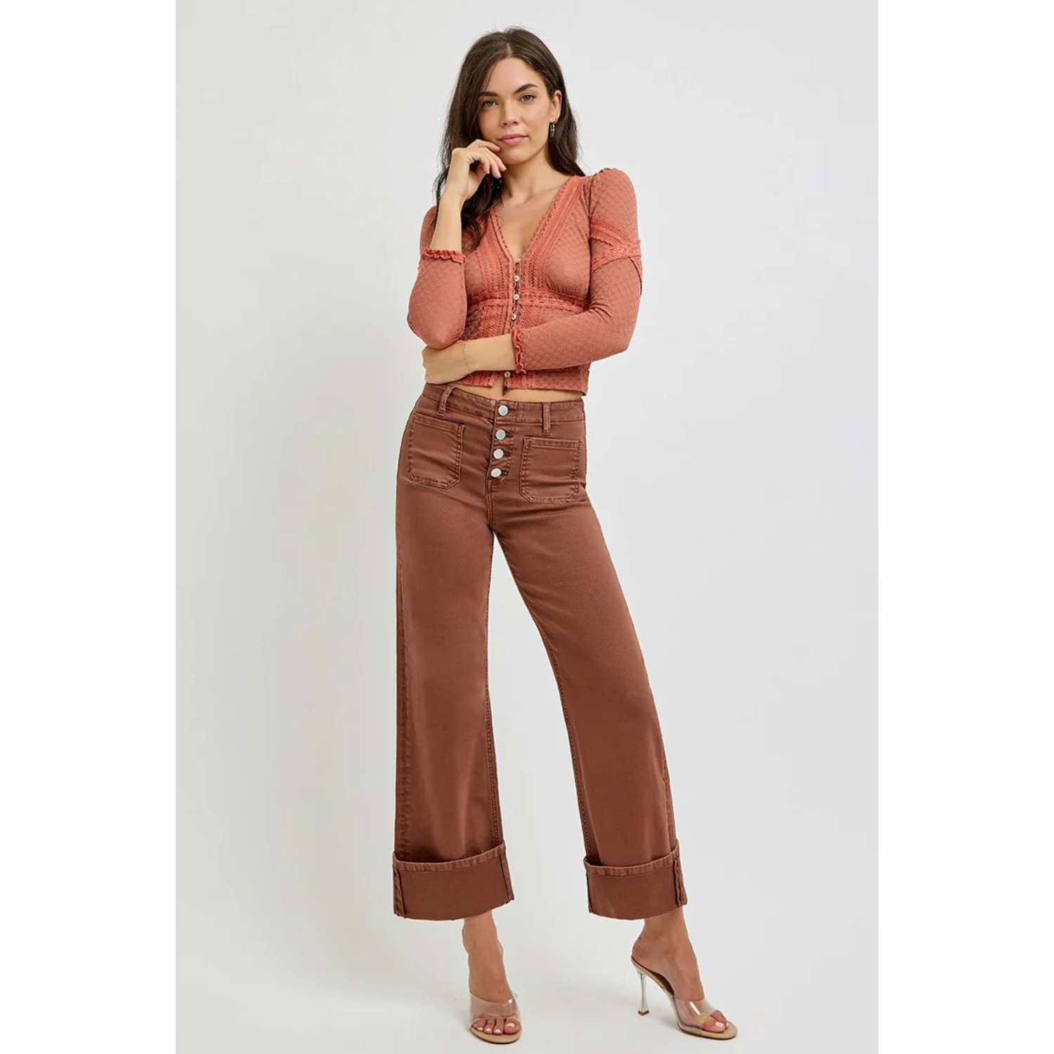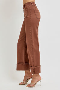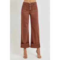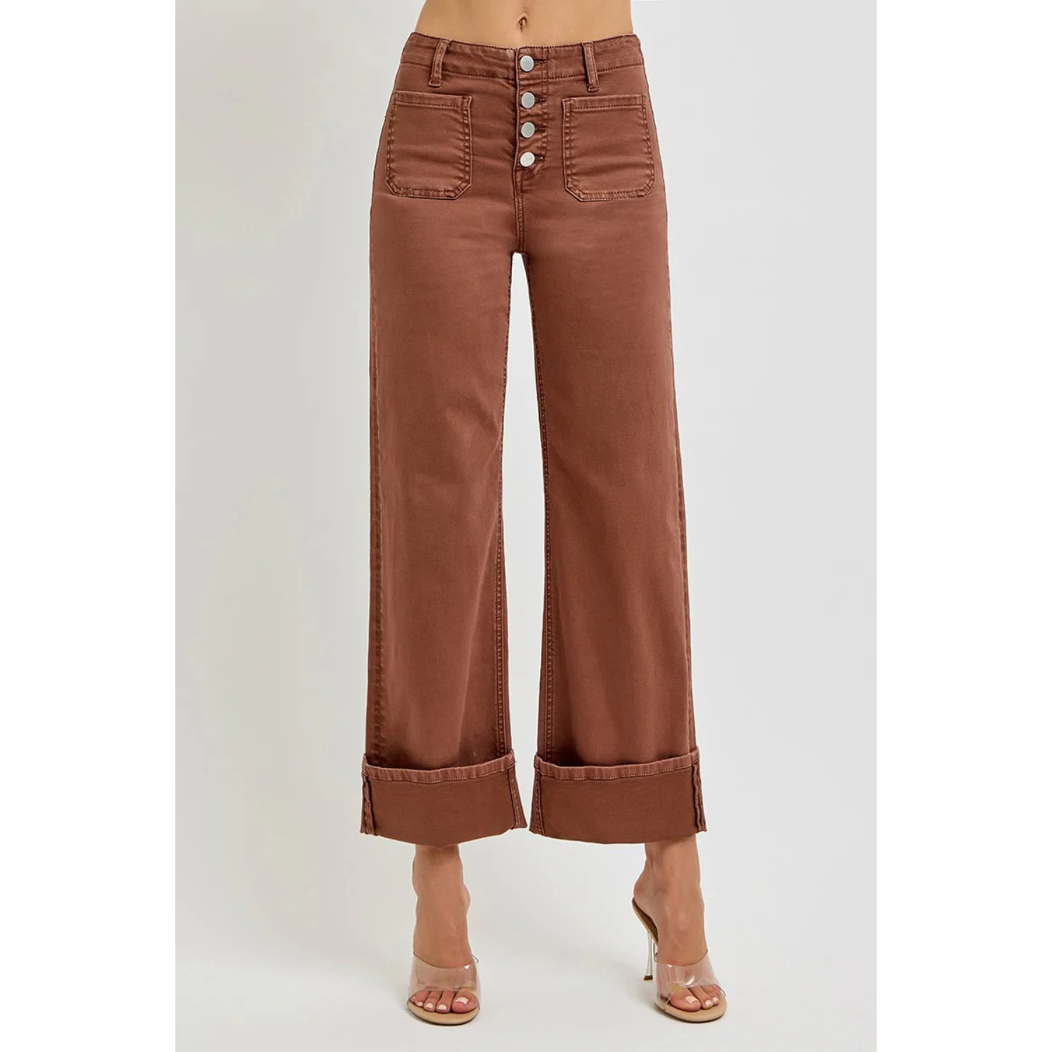 Espresso-Risen High Rise Wide Leg Front Patch Pocket Cuffed Pants
