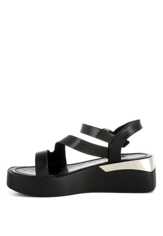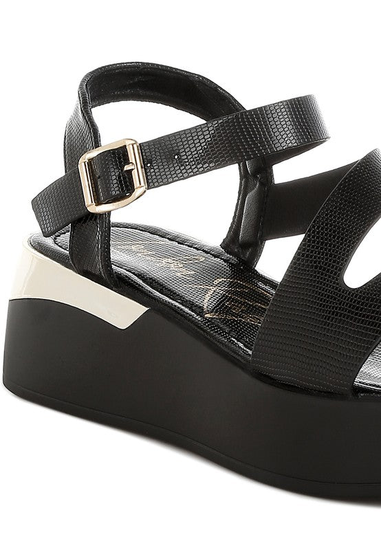 The sandals are a summer favorite with the chunky flatforms and the embossed faux leather upper which gives it a chic look. The pin buckle fastening ensures a secure fit and the metallic accent elevates the visual aesthetic of the sandals.