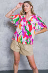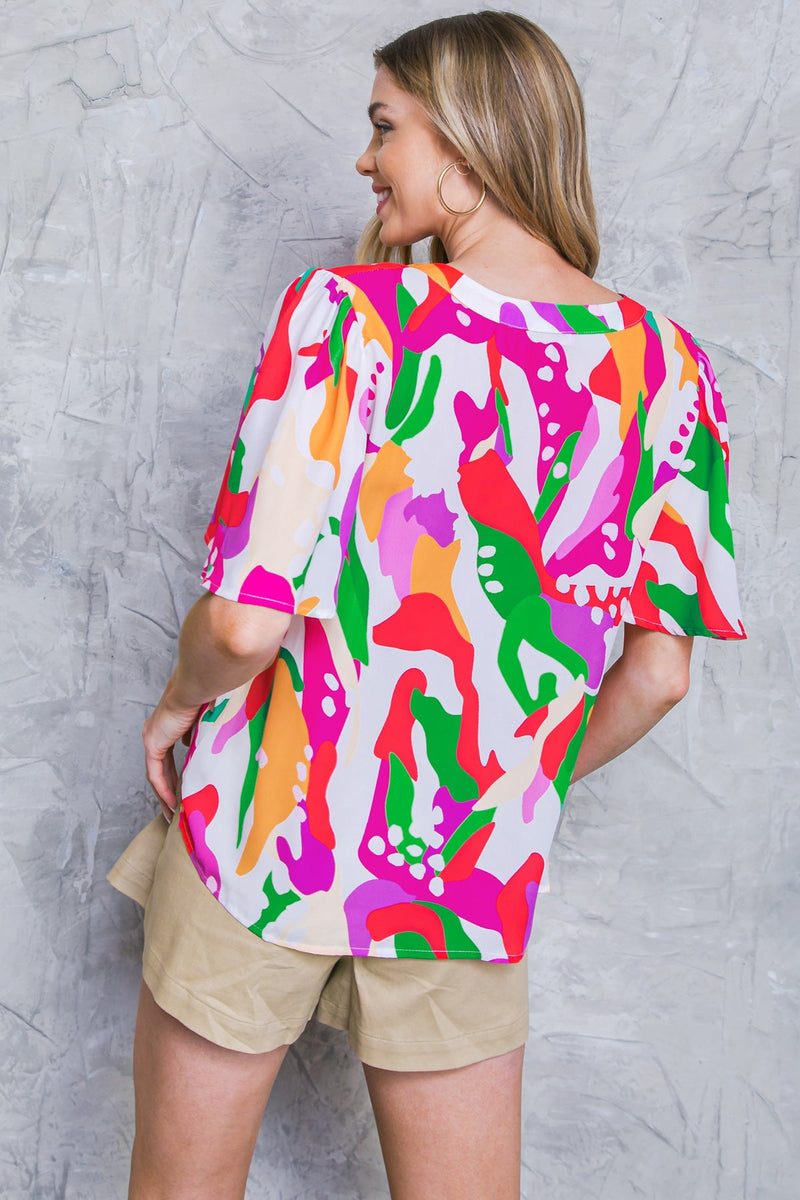 This STYLISH SUMMER WOVEN TOP is perfect for staying cool and stylish in the summer. It features a round neckline with a V-front, short flutter sleeves, and a relaxed body for a comfortable fit. This top will be a great choice for dressing up any casual outfit.