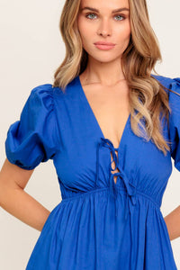 A solid royal blue woven maxi dress featuring V neckline with front bow closure, short puff sleeve, elasticized empire and tiered skirt.