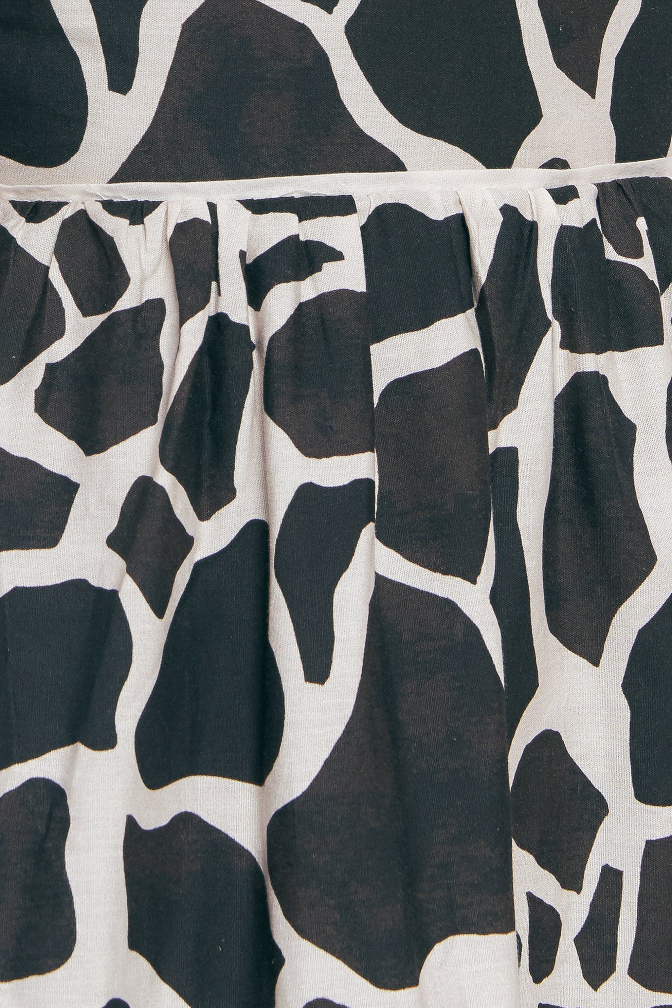 A printed woven midi dress featuring cami top, waist yoke, tiered skirt and smocked back bodice