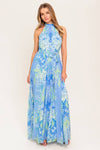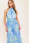A printed woven maxi dress featuring halter neckline, self sash tie and back neck tie.