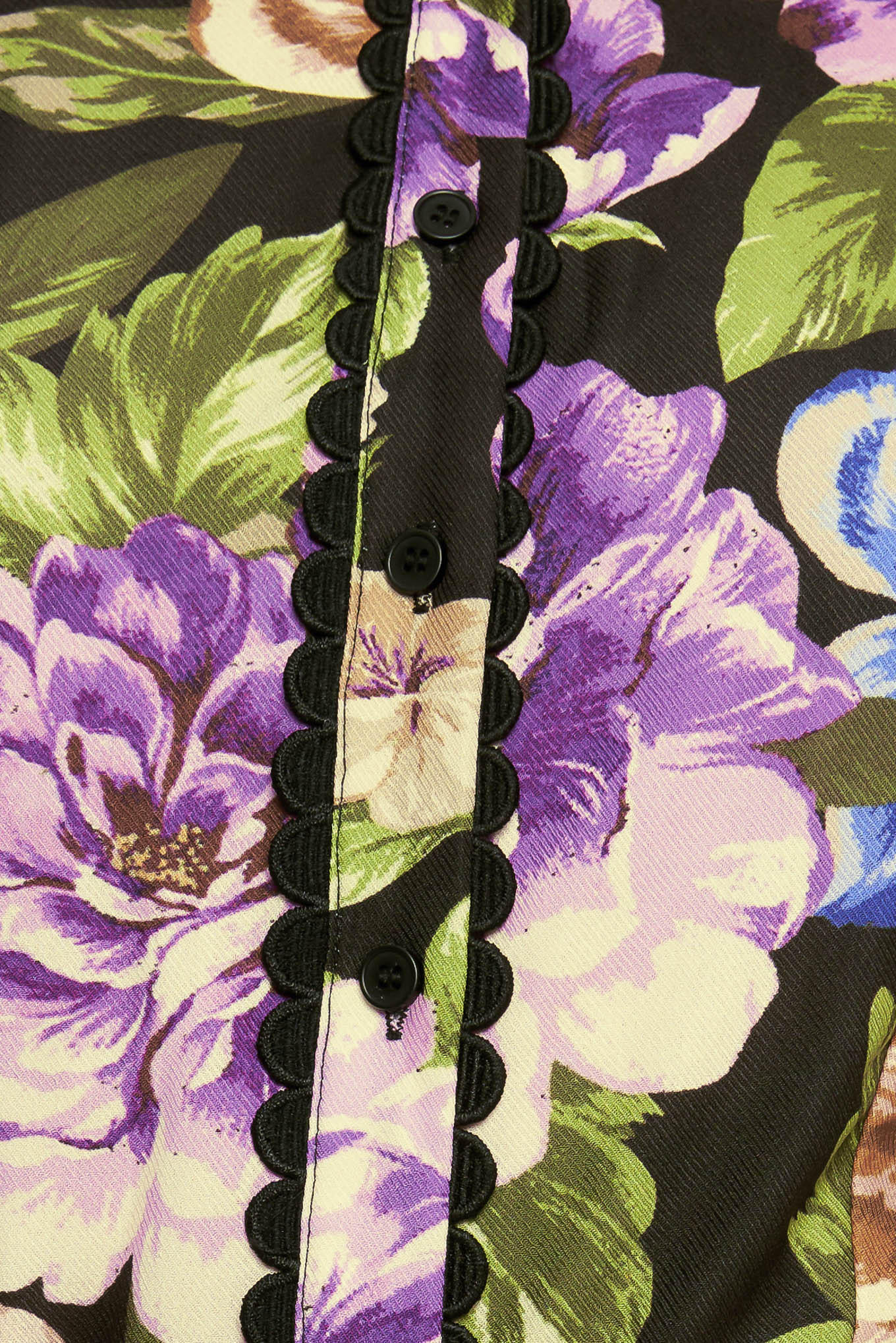 A printed woven midi dress featuring collar, short puff sleeve with cuff, button down closure and self sash tie