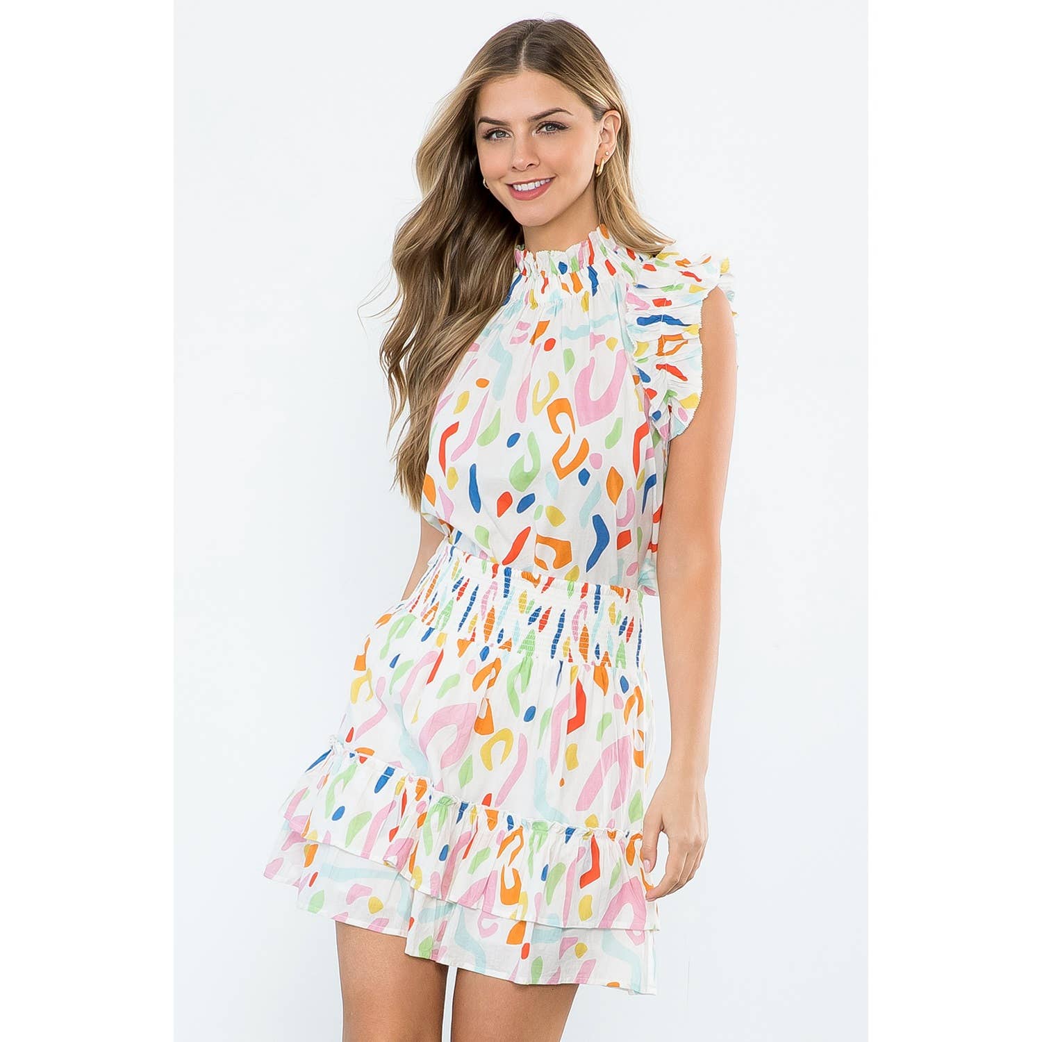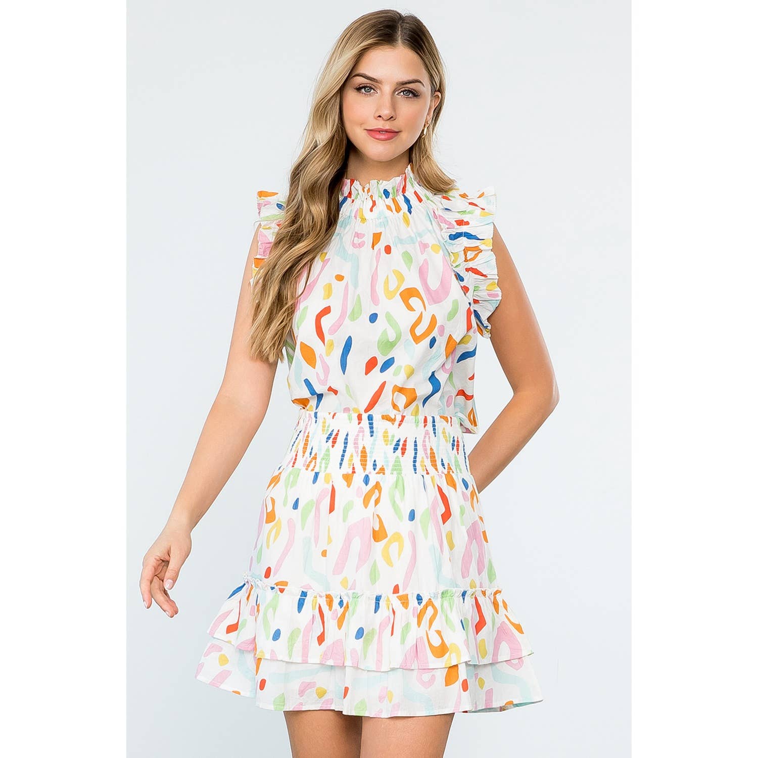 Featuring a striking abstract print, the SAVANNAH White Smocked Ruffle Skirt is a must-have addition to your wardrobe. Embrace the bold design and make a statement with every step.